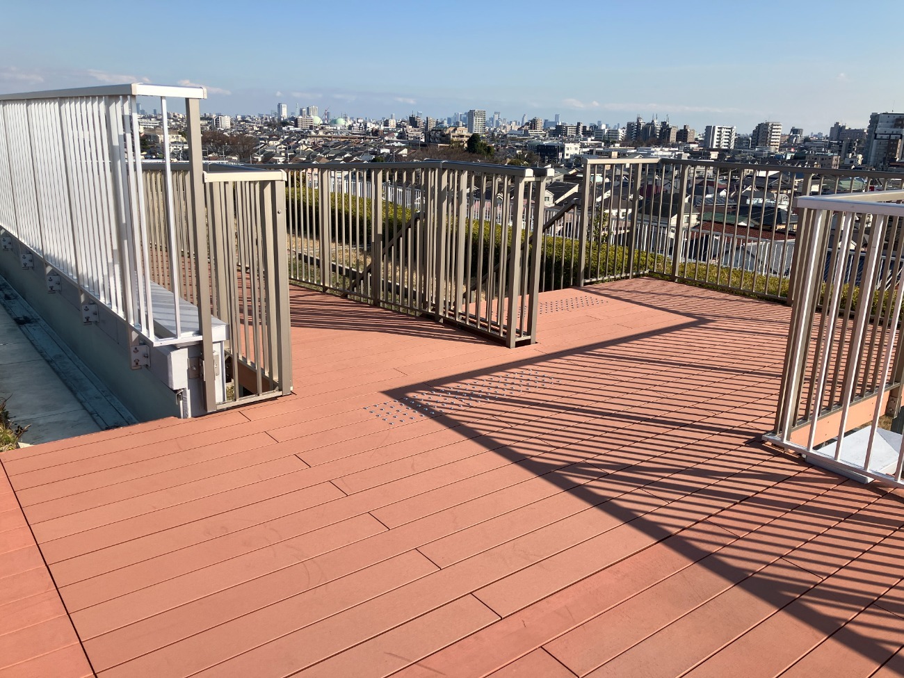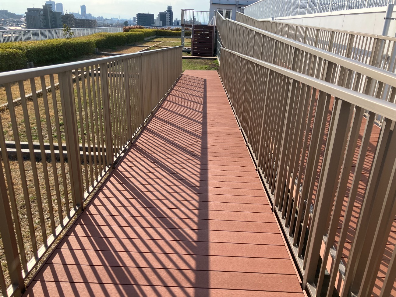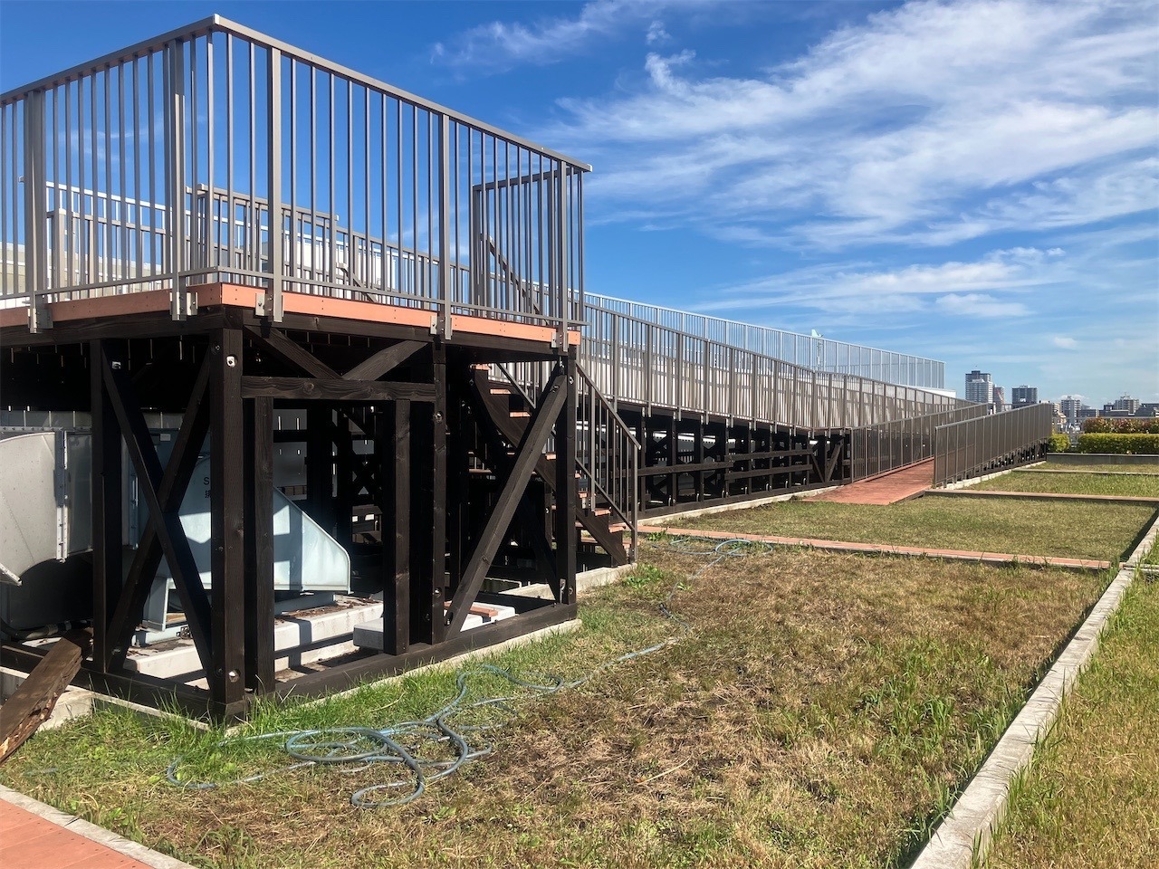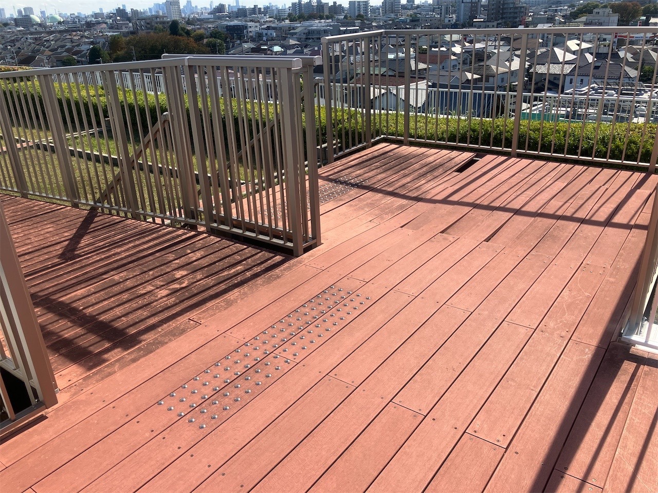 | 施工の目的 | 既存ウッドデッキの老朽化による撤去・新設 ・既存はスロープ架台は木製 ・新規スロープ架台は高耐食鋼板(ZAM材)使用。 ウッドデッキ床材は樹脂製を使用。 |